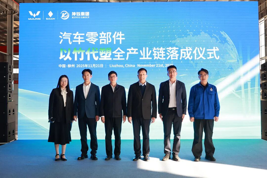11月21日,由上汽通用五菱主导建设的汽车零部件“以竹代塑”全产业链在柳州正式贯通。国际竹藤中心党委书记、副主任尹刚强,三江县县长陈震,柳州市林业和园林局副局长李钊,上汽通用五菱副总经理赵肖斌,湖北坤钰集团董事长罗文伟等政企学研各界嘉宾共同出席贯通仪式,见证这一汽车产业绿色转型成果的诞生。