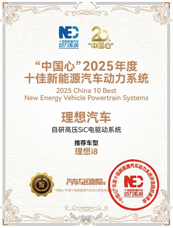 近日,“中国心” 2026 年度动力日暨第十届中国汽车动力技术大会圆满举办。作为国内新能源动力领域极具权威性的评选活动之一,本次大会揭晓的“年度十佳新能源汽车动力系统” 榜单备受行业瞩目。其中,理想 i8 搭载的理想自研高压 SiC 电驱动系统凭借多项核心技术突破,成功斩获这一殊荣。